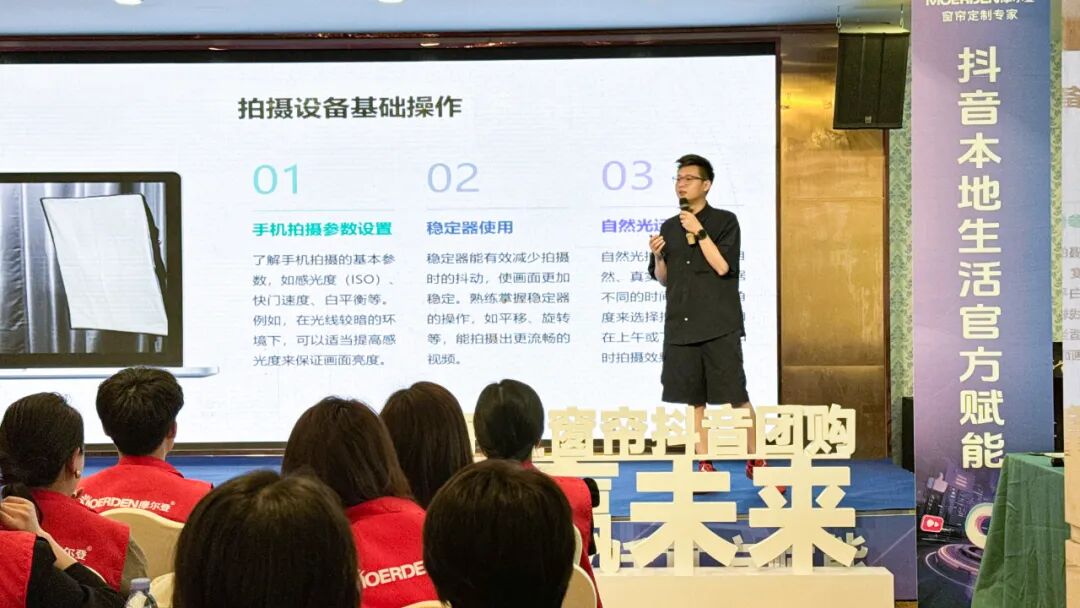 “抖音本地生活家居品类交易规模年增速超200%,但流量竞争已从‘野蛮生长’进入‘精耕细作’阶段。门店若想持续领跑,必须从‘会拍视频’升级为‘懂数据、会运营、能转化’的全能选手。”--摩尔登窗帘品牌创始人廖展祥在开场致辞中号召大家:看清趋势,拥抱未来。”数据显示,2025年第一季度抖音本地生活家居类目中,‘定制窗帘’搜索量同比激增430%,但转化率两极分化严重——头部门店单月团购核销数量逐步增长,而多数门店仍困于“有曝光无转化”的泥潭。“--摩尔登总经理刘利娟针对窗帘行业团购现状指出。